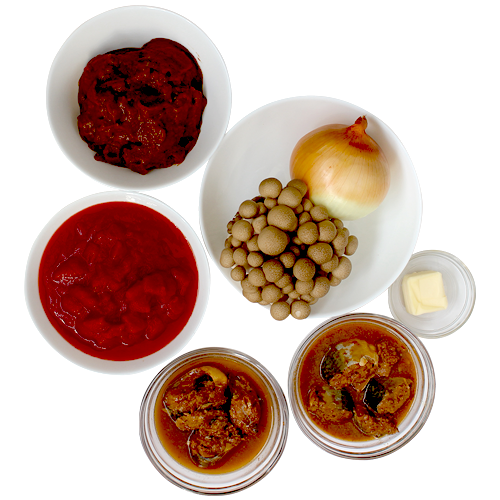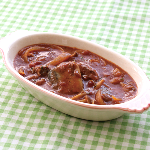- さばの味噌煮缶、カットトマト缶、デミグラスソース缶、水を入れ、弱火で10分ほど煮込んで完成。
